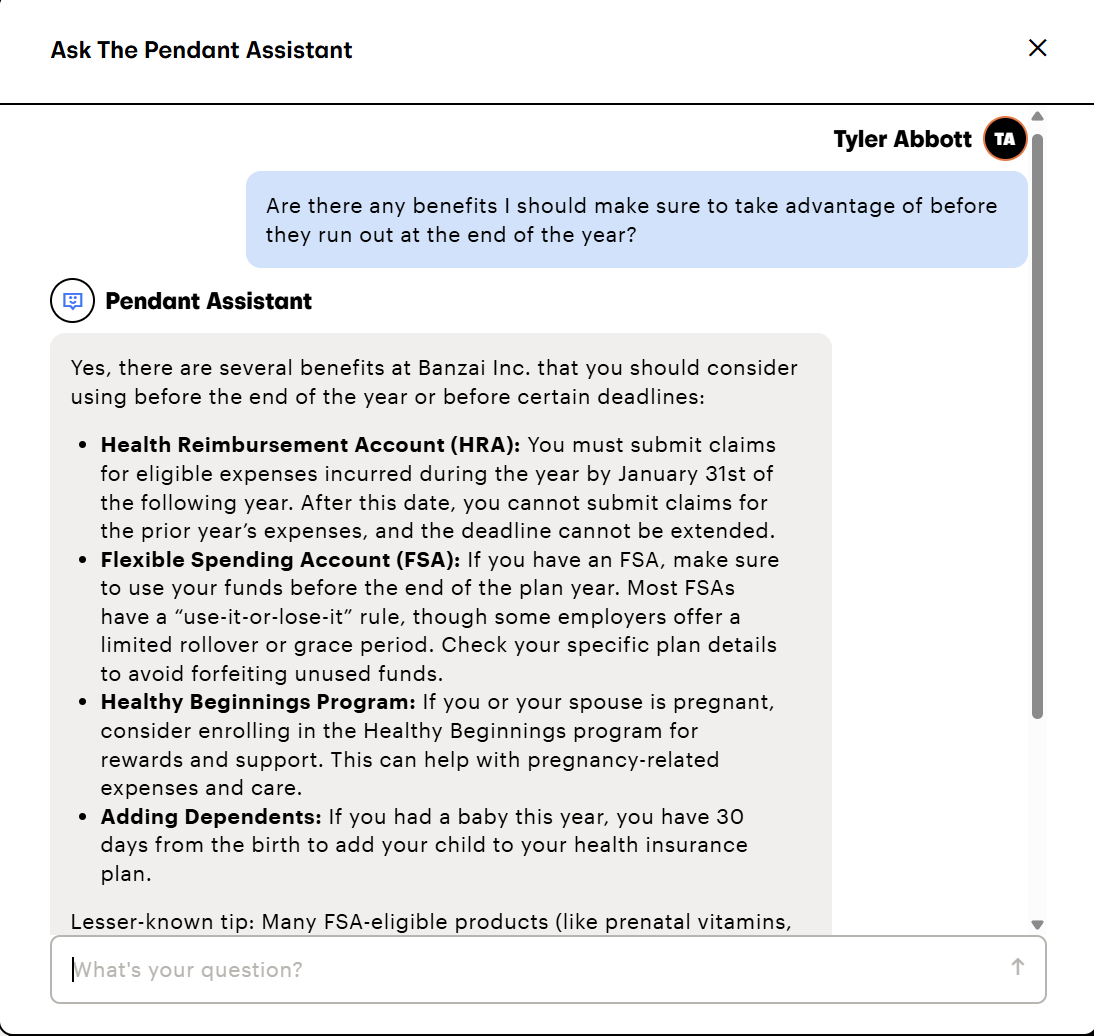 The biggest barrier for employees to actually use these benefits certainly isn’t lack of interest—it's the difficulty of finding the right information at the right time.This is where Pendant’s AI Assistant can make a big difference.
